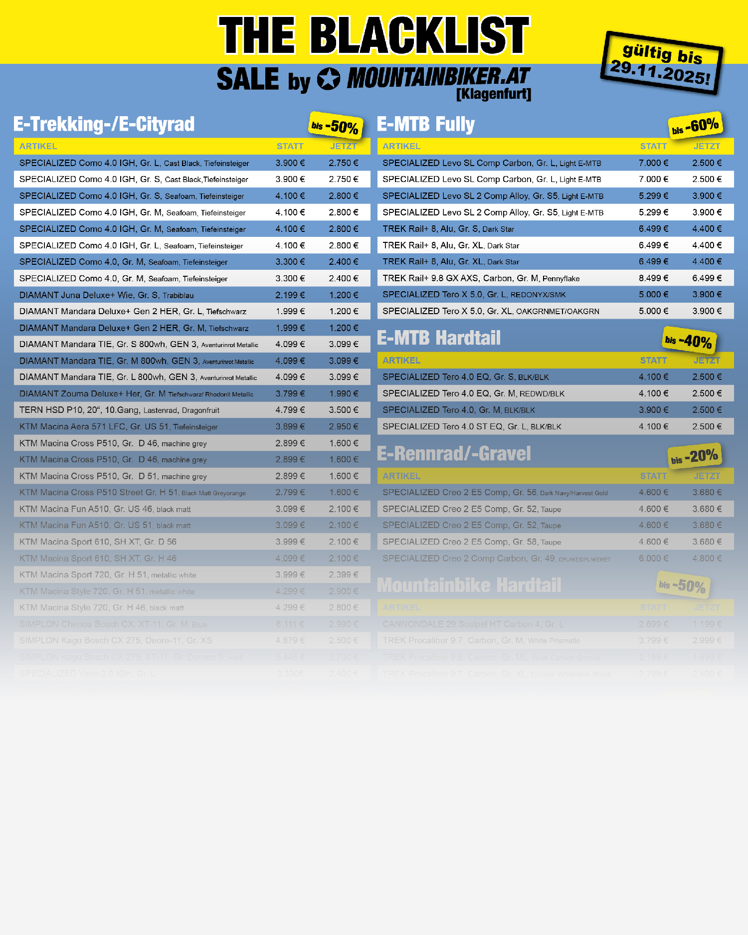 Ab sofort über 100 lagernde Fahrräder im SALE - nur bis 29. November 2025 und nur solange der Vorrat reicht!HIER die gesamte Liste!